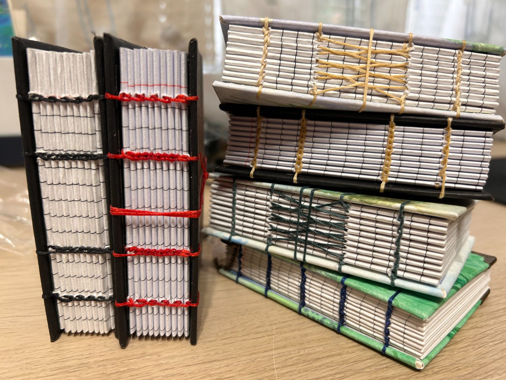 Každý blok papíru je ručně přišit k dalšímu pomocí viditelného řetízkového stehu na hřbetu. Právě tento dekorativní steh je poznávacím znakem koptské vazby – nejen funkční, ale i estetický prvek, který dává každému kusu osobitý charakter.