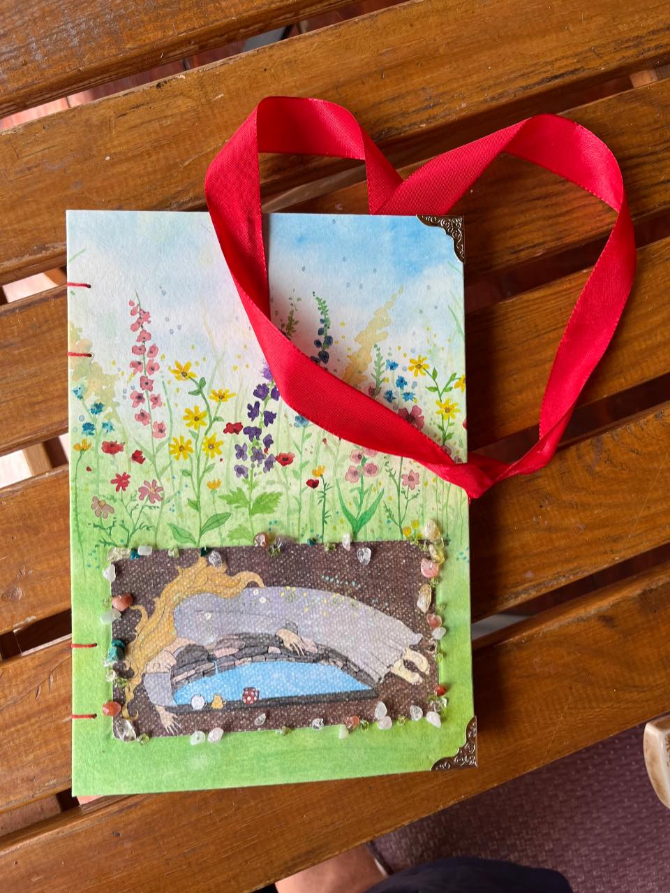 Tento památníček pro Samaritánku (není na prodej) jsem vázala s pokorou, laskavostí a pozitivní energií. Je protkaný kouzelnými kamínky, které tyto energie umocní . Tenhle deníček není jen tak obyčejný. Je určen všem poutníkům, kteří do lesa přicházejí s otevřeným srdcem. Můžou do něj zapsat svá přání, vzkaz studánce, verš, dětskou malůvku nebo jen tak tiché "Děkuji".